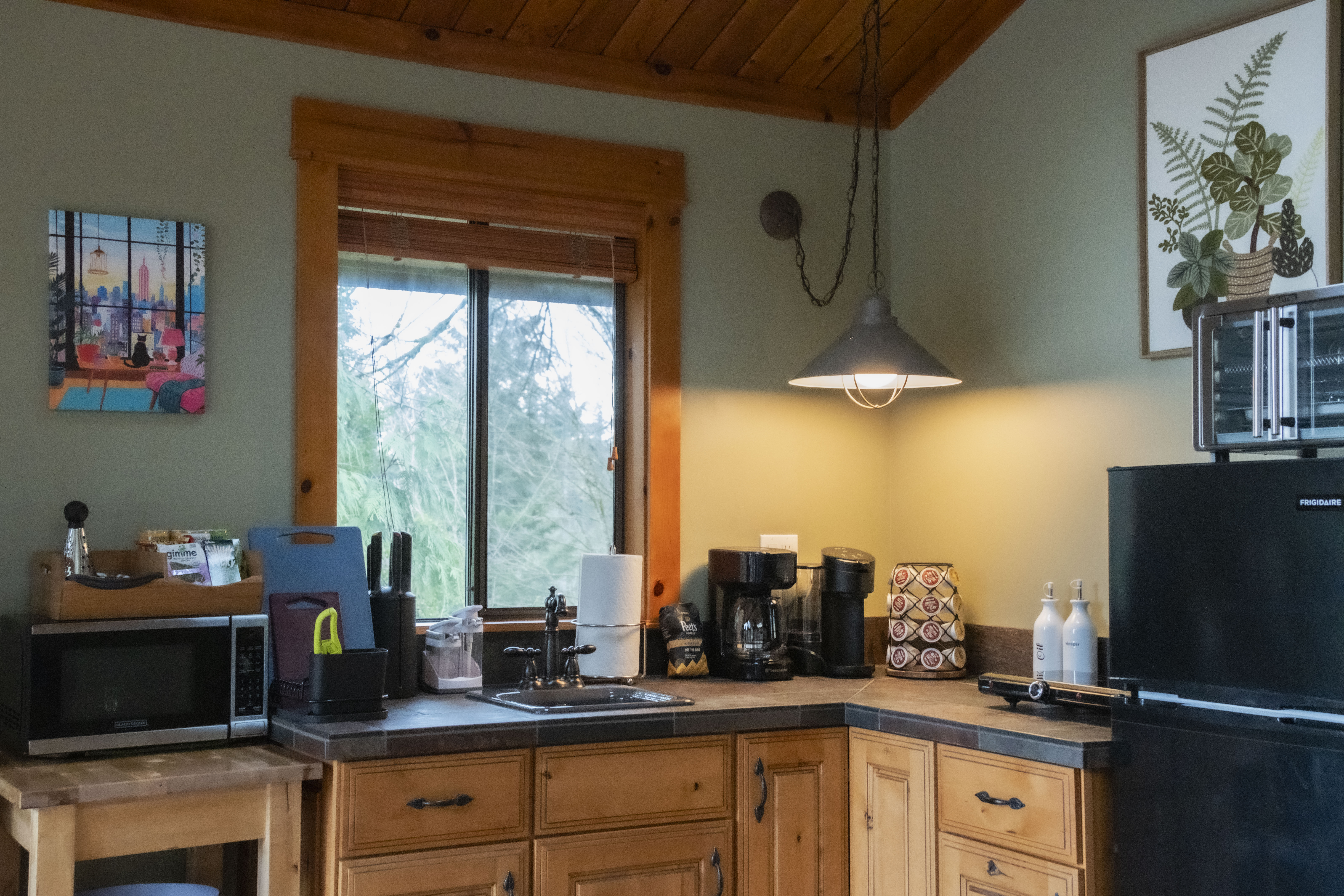 The master bedroom features a king-size bed with premium linens, ensuring a restful night's sleep. The spa-inspired bathroom includes a soaking tub and rainfall shower. Whether you're planning a romantic getaway or a peaceful retreat, the Rainier View Suite delivers an unforgettable experience.